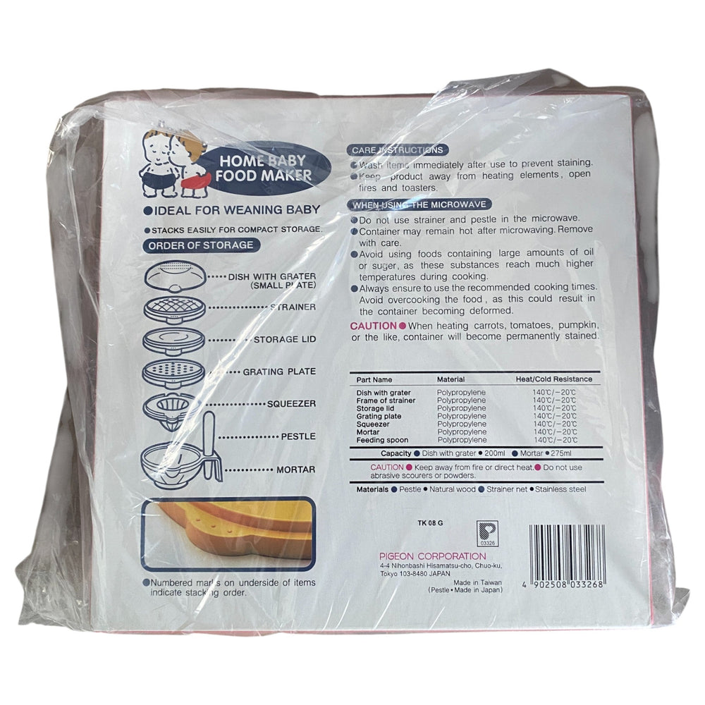 The Pigeon Home Baby Food Maker is an all-in-one solution for preparing healthy meals for your little one. It lets you grate, strain, squeeze, grind, and store baby food with ease, making weaning simple and convenient. Compact and easy to store, it is made from BPA-free materials and is safe for microwave, freezer, and refrigerator use. The set includes a dish with grater, strainer, storage lid, grating plate, squeezer, mortar, pestle, and spoon, providing everything you need to prepare fresh and nutritious meals for your baby.