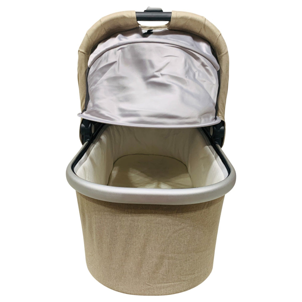 The UPPAbaby Bassinet is suitable from birth up to 9kg and 25in long, or until infant can push up on hands and knees, whichever comes first. It has a vented section at the bottom with a removable, breathable mattress. A mesh insert on the canopy's back ensures even more breathability for your baby. An extensible XL sun canopy with SPF 50+ effectively protects your child from harmful UV rays. The inside lining of the bassinet is water-repellent, keeping your baby dry and comfortable. The bassinet can be quickly and easily attached to the frame using adapters. It can be manually placed on the frame before being removed to transport your sleeping baby. In the UPPAbaby Baby Bassinet, your child is always safe, comfortable, and secure.