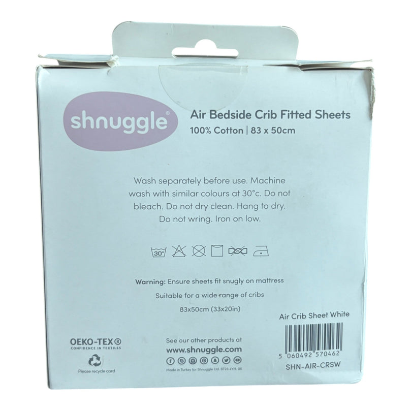 The Shnuggle Air Crib Fitted Sheets are made from 100% super soft cotton to ensure your baby enjoys a breathable, cozy, and safe sleep.This 2-pack of white sheets is gentle on delicate skin and helps regulate baby’s body temperature through the night.