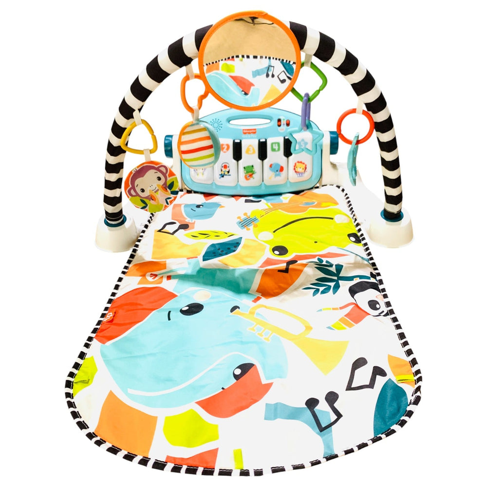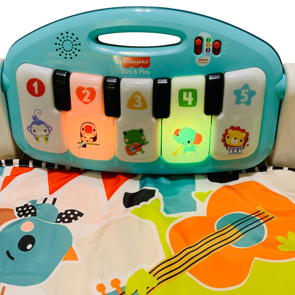 The Fisher-Price Glow & Grow Kick & Play Piano Gym - Blue is a versatile baby activity mat designed to engage and entertain your little one from newborn to toddler. This soft playmat features a repositionable high-contrast toy arch with 10 linkable toys, including a jingle ball, butterfly teether, crinkle toy, self-discovery mirror, and colorful shape links. The removable piano includes 5 light-up keys and 4 musical settings, including a freestyle mode, offering endless musical fun. With 3 Smart Stages™ learning levels and over 85 songs, sounds, and phrases, it introduces babies to animals, colors, numbers, and shapes while supporting tummy time, lay and play, and sitting up. Made with a soft, machine-washable mat, the Glow & Grow Piano Gym combines music, lights, and learning to create an interactive and educational experience.