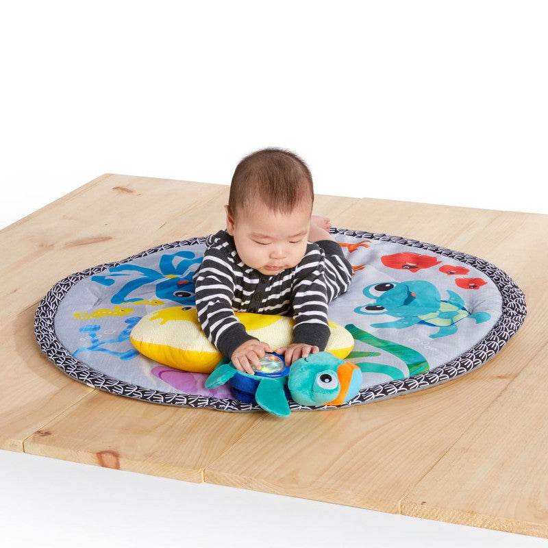 The Baby Einstein Sea Friends Activity Gym invites your little one to an ocean floor exploration filled with lights and melodies. This infant play gym features over 20 minutes of soothing lights and melodies from around the world, encouraging engagement and curiosity. Neptune’s belly forms a 360-degree canopy with glowing lights and interactive hanging toys that promote eye tracking and neck muscle development. Detach the plush fish, ring rattle, shell mirror, crab bead chaser, or sand dollar teether for on-the-go fun. The included prop pillow supports tummy time, with fabric loops for attaching hanging toys.
