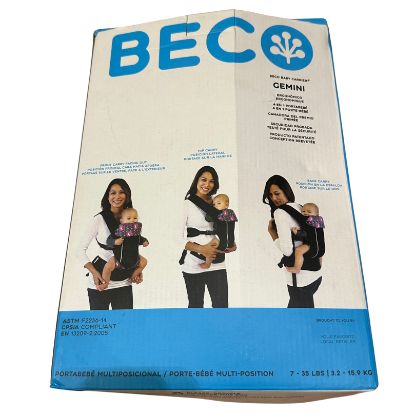 The Beco Gemini Baby Carrier is a new and improved ergonomic carrier designed for both comfort and durability. With four versatile carry options, it supports your baby from newborn to toddler (7-35 lbs / 3.5 - 16 kg). Featuring redesigned shoulder straps with a new safety catch and superior padding, this carrier provides exceptional comfort and support for both parents and babies. The adjustable waist belt and shoulder straps ensure a secure and pain-free fit for extended use. Whether front, back, or hip carry, the Beco Gemini guarantees safety, comfort, and style.