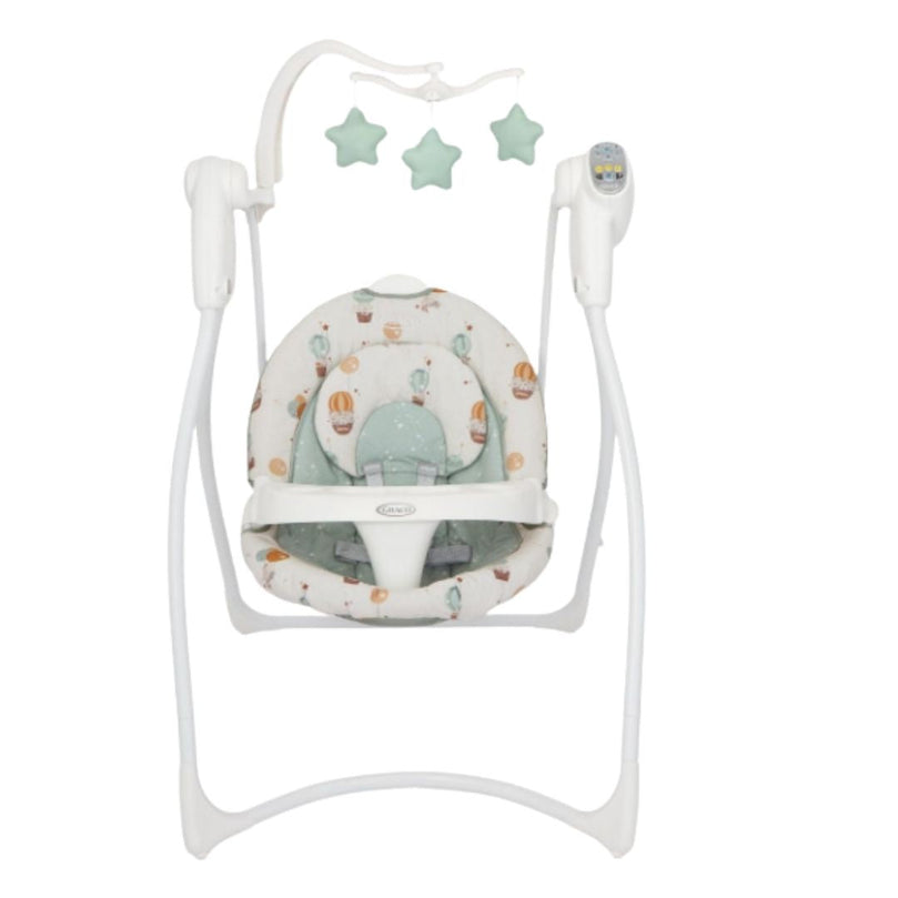 The Graco Lovin' Hug Swing with 6 Swing is designed to keep your little one comfortable and entertained. With six adjustable swing speeds and four reclining positions, you can customize it to your baby's needs. The rotating tray makes it easy to place and remove your baby, while also providing a convenient spot for snacks. It includes soothing melodies, nature sounds, and a mobile with plush toys for added stimulation. The swing can be powered by an AC adapter or batteries for convenience.