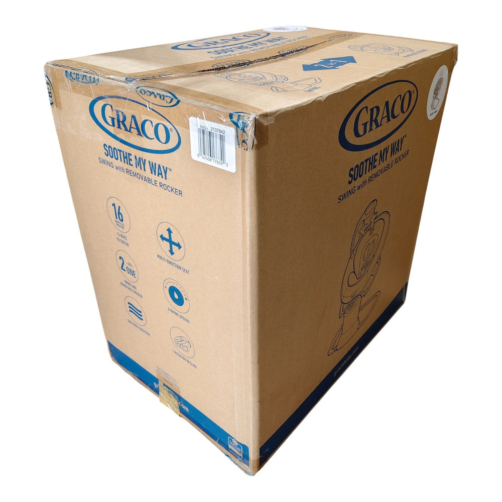 The Graco Soothe My Way Swing with Removable Rocker features 8 soothing motions in 2 directions, for 16 ways to soothe baby. The 2-in-1 design offers a swing seat that doubles as a removable rocker for use throughout the home. Plush fabrics and a removable body support provide added comfort for your little one. The multi-directional seat allows baby to swing facing front, right, or left, for the most soothing options. A 5-point harness keeps baby secure with 6 swinging speeds allow parent to adjust for baby's happiness and 3 position recline makes for baby's optimal comfort. Choose from 15 songs and sounds, 10 melodies and 5 nature sounds, plus 2 vibration speeds to calm and comfort baby. The adjustable toybar features 2 soft toys to keep baby entertained.