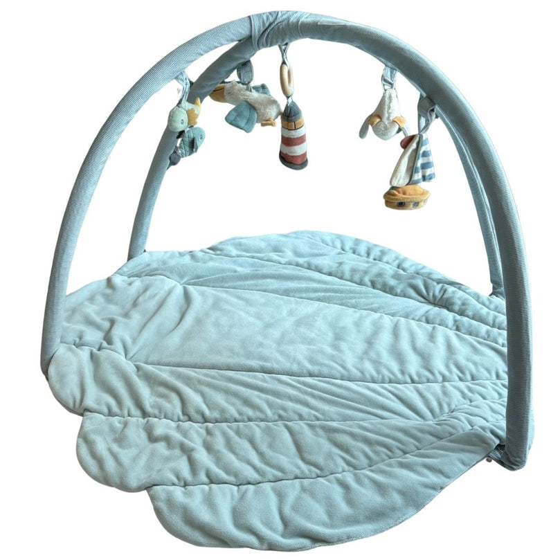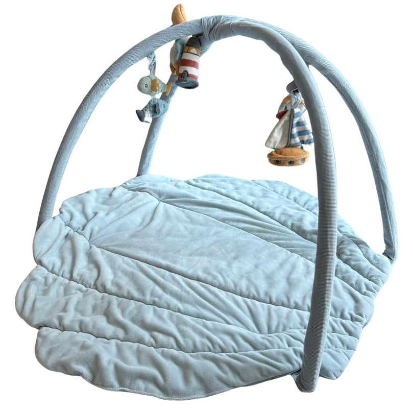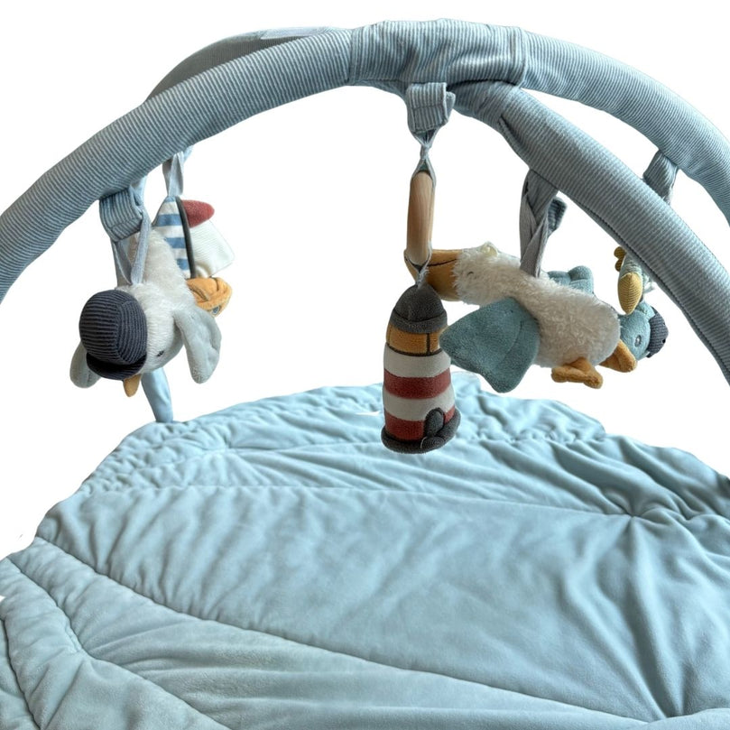 The Little Dutch Activity Arch Play Mat activity play mat keeps little ones curious and engaged. Shaped like a shell, it offers a cozy and stimulating space for babies to explore. Five adorable hanging soft toys – a seagull, pelican, lighthouse, sailboat, and a pair of fish – encourage reaching, grasping, and movement. Perfect for supporting sensory development and hand-eye coordination, this mat turns everyday play into an adventure. Pair it with other toys from the Sailors Bay collection for a beautifully coordinated nursery or playroom.