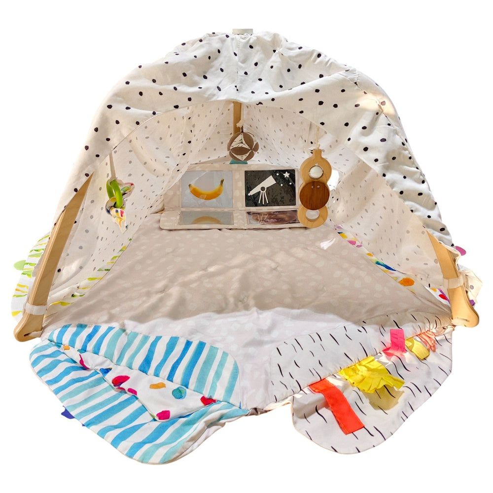The Lovevery The Play Gym is an award-winning developmental play mat designed to support your baby’s physical, cognitive, visual, and motor development from tummy time to toddler play. Created by child development specialists, it offers a full year of learning through play with five Montessori-inspired sensory zones that reveal or conceal to prevent overstimulation. Made with baby-safe, sustainable materials including FSC-certified wood and organic cotton, the Play Gym includes age-appropriate activity guides, removable learning accessories, and adjustable card clips to engage your baby from every angle. Easy to set up and thoughtfully designed, it grows with your baby through every milestone.