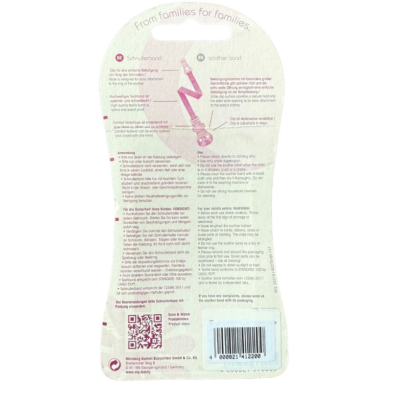 The NIP Soother Band is designed to keep your baby’s soother clean and easily accessible. Featuring an extra-wide opening, it allows for convenient attachment to your baby’s clothes. Made from high-quality, saliva and sweat-resistant textile, the band ensures durability and safety. The BPA-free clip provides a secure hold without damaging your baby’s clothing.