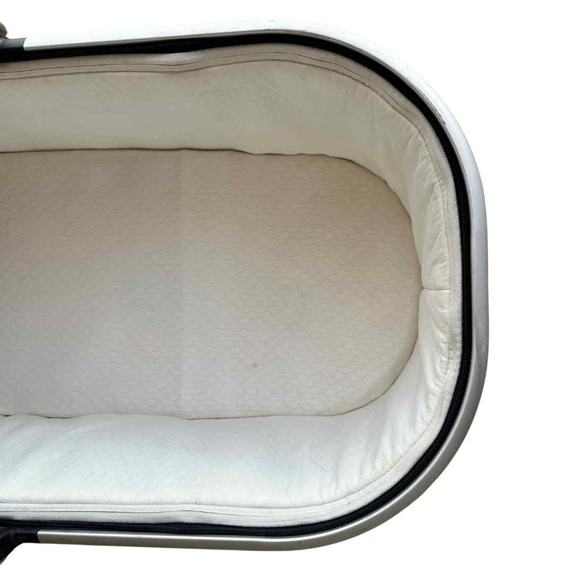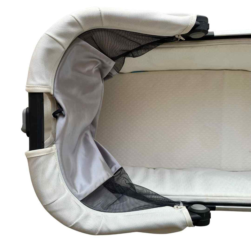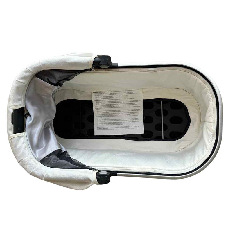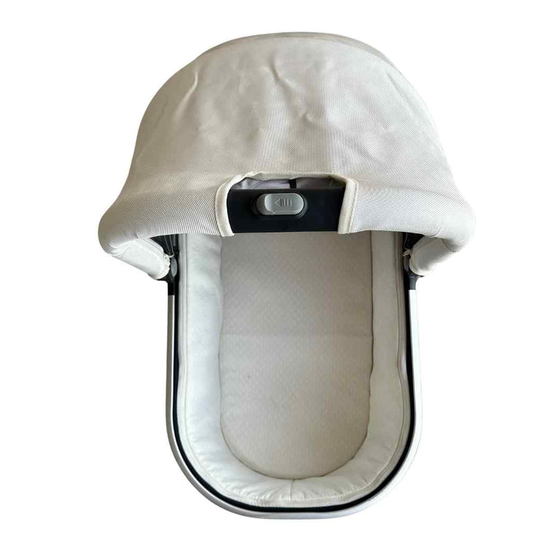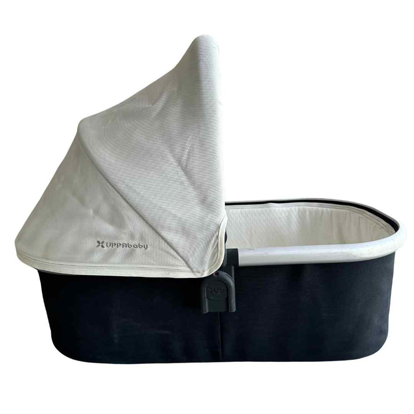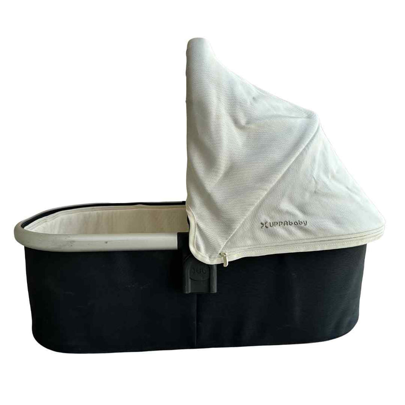The UPPAbaby Bassinet is suitable from birth up to 9kg and 25in long, or until infant can push up on hands and knees, whichever comes first. It has a vented section at the bottom with a removable, breathable mattress. A mesh insert on the canopy's back ensures even more breathability for your baby. An extensible XL sun canopy with SPF 50+ effectively protects your child from harmful UV rays. The inside lining of the bassinet is water-repellent, keeping your baby dry and comfortable. The bassinet can be quickly and easily attached to the frame using adapters. It can be manually placed on the frame before being removed to transport your sleeping baby. In the UPPAbaby Baby Bassinet, your child is always safe, comfortable, and secure.