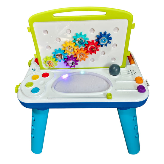 The Baby Einstein Curiosity Table is an engaging two-sided art and science activity table designed to unleash your child's creativity and curiosity. Featuring removable spinning gears, color-discovery circuits, and flashing lights, it encourages hands-on learning as kids make the light bulb illuminate when gears connect. This developmental toy plays over 65 melodies and introduces vocabulary in English, Spanish, or French, with adjustable volume for a customized experience. The middle art panel is removable and attaches to the table ends, providing a drawing surface and dry erase whiteboard for endless creative and educational play.