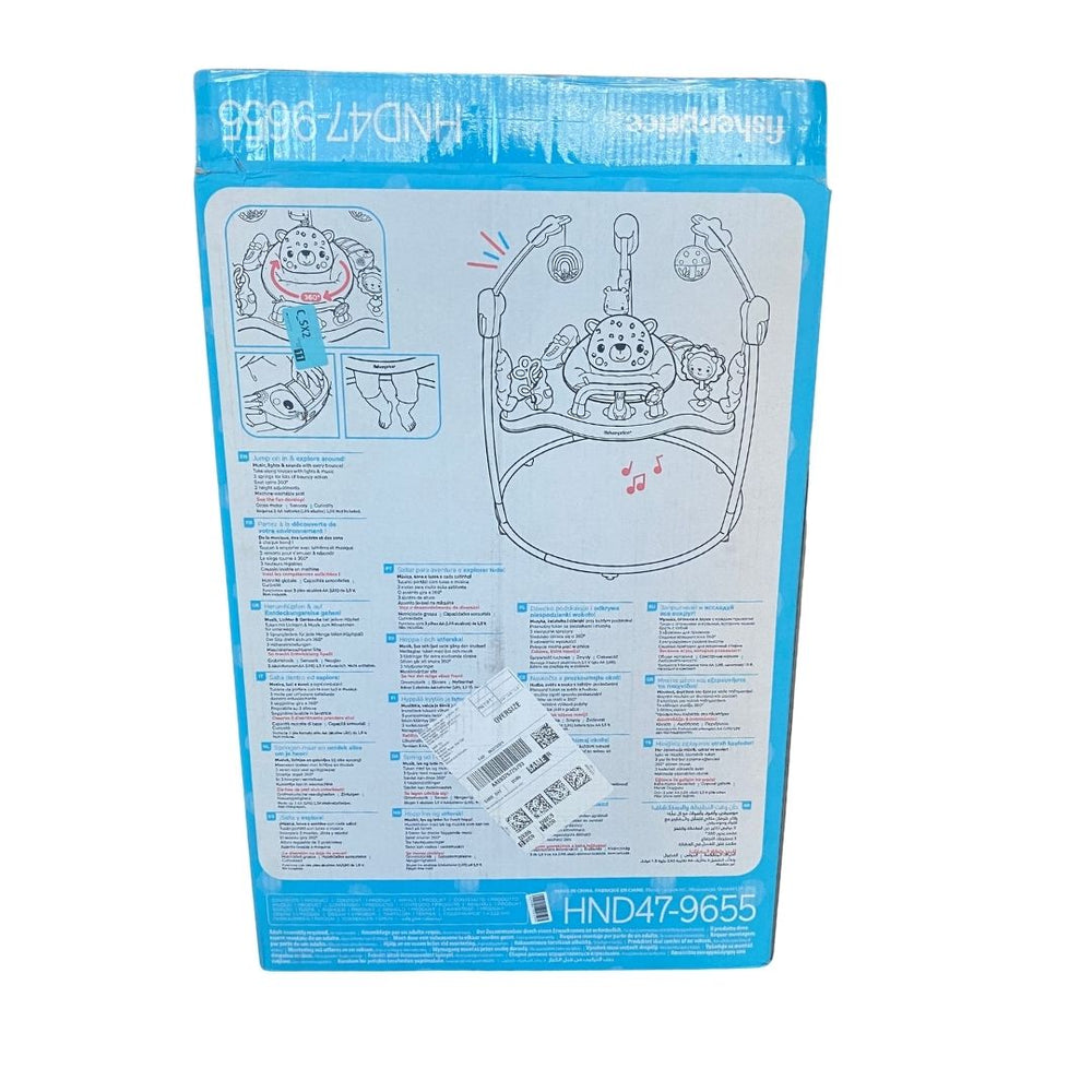 The Fisher-Price Leaping Leopard Jumperoo is an interactive toddler activity center designed to entertain and stimulate your baby. Every jump is rewarded with fun lights, music, and engaging sounds, encouraging active play and exploration. The 360-degree spinning seat lets your little one reach and interact with a variety of toys, including a patting monkey, elephant, spinning butterfly, lion, rocking alligator, and giraffe rattle. A removable toucan provides 20 minutes of music and light effects. The stand adjusts to three heights to grow with your child, and the machine-washable seat ensures easy cleaning. Perfect for developing gross motor skills while stimulating sight, hearing, and touch.