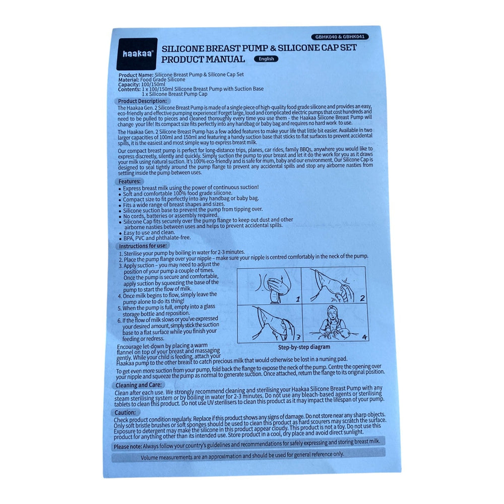 The Haakaa Manual Breast Pump 5oz/150ml is the perfect breastfeeding partner. Made of a single piece of high quality food grade silicone, the haakaa silicone breast pump fit every shape and size of breast for hand-free collecting milk by its excellent suction comfortably and perfectly. This set includes a breast bump cap to secure the precious milk collected.