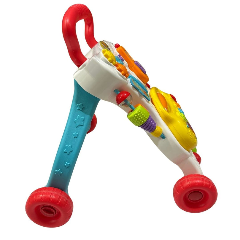 The Juniors Grow With Me Musical Walker is designed to support your little one as they take their first steps while also providing engaging activities to stimulate their senses. The walker features textured wheels, an easy-grip handle, and a durable design for stable walking support. The activity panel is loaded with interactive elements like light-up buttons, shape sorters, gears, animal buttons, and a role-play phone, all of which introduce your child to numbers, shapes, and animals through fun music and phrases.