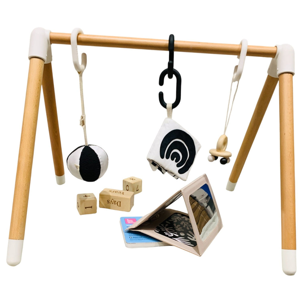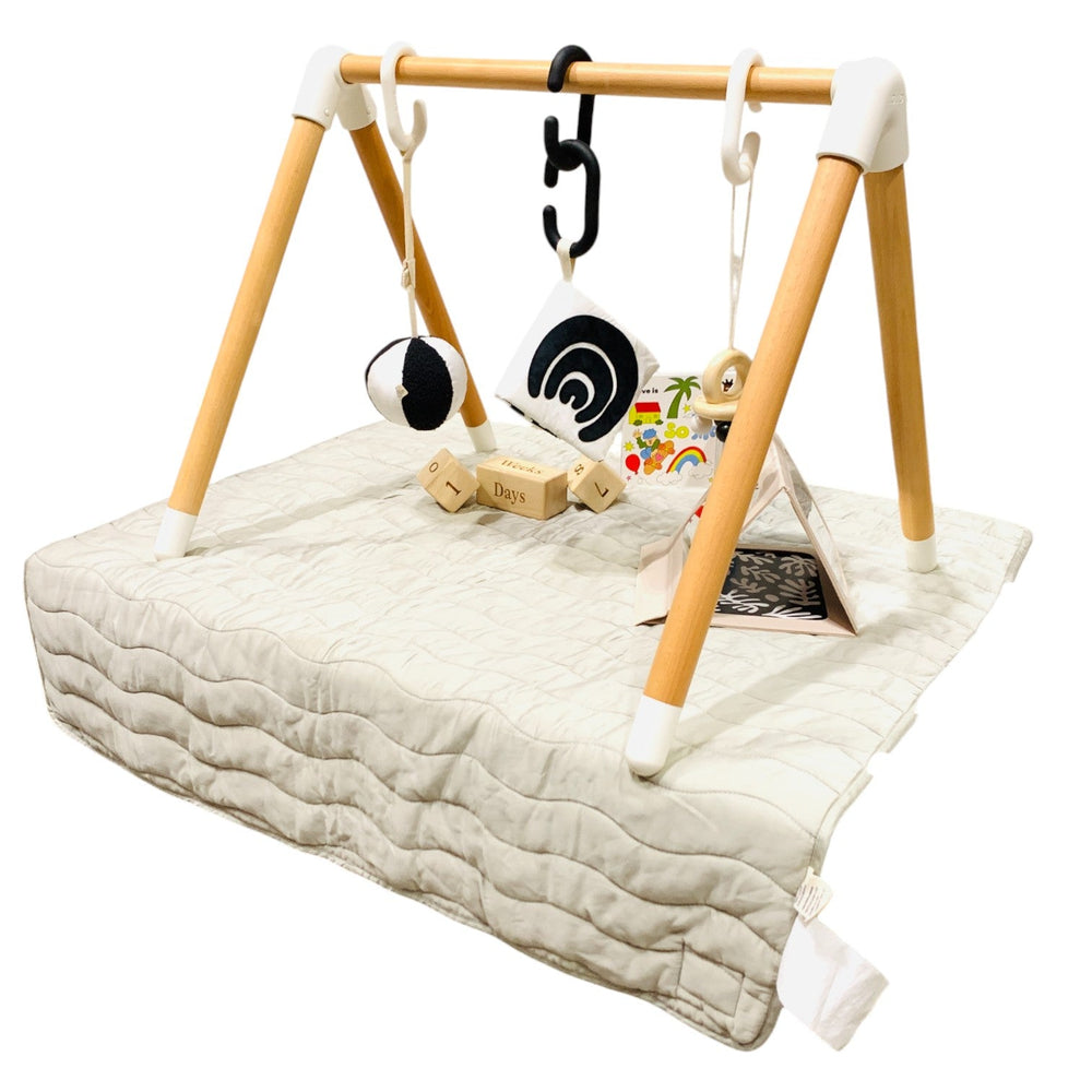 The Lalo Baby Gym & Playmat in Sage is a versatile two-part play system designed to support your baby’s growth and discovery. Featuring a sustainably sourced FSC-certified beechwood gym frame and an eco-friendly lyocell play mat, it promotes cognitive and motor skill development from day one. Adjustable and adaptable, this baby gym transitions seamlessly from tummy time to storytime, while the included sensory ball, mirror prism, and silicone teether offer engaging, age-appropriate stimulation. Easy to clean, the play mat and sensory ball are machine washable, the teether is dishwasher-safe, and the mirror wipes clean with a damp cloth.