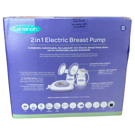 The Lansinoh 2 in 1 Double Electric Breast Pump is designed for flexible, convenient, and comfortable milk expression. Use it as a single or double pump at home with AC power, or on-the-go with batteries. Its hospital-grade performance offers 3 pumping styles and 8 suction levels, with separate ‘Let Down’ and ‘Expression’ phases to optimize milk flow. The super-quiet design with back-lit LCD allows discreet nighttime pumping, while the hygienic closed system prevents milk from entering tubing. Pump directly into Lansinoh bottles or storage bags for safe storage.