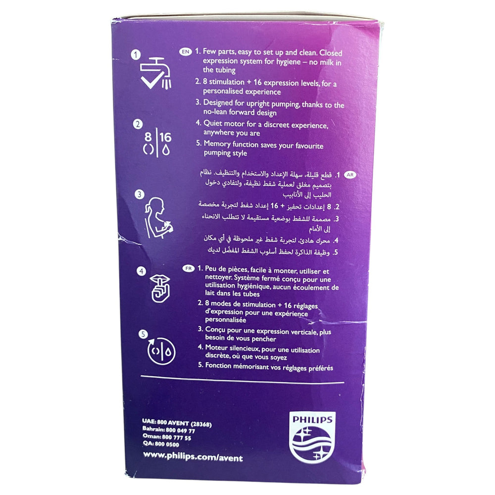 The Philips Avent Electric Breast Pump combines natural motion technology with personalized settings to optimize milk flow and make expressing more comfortable. Its unique cushion adapts to your nipple size, ensuring a perfect fit for nearly all shapes and sizes. Designed for a relaxed experience, it allows you to express without leaning forward, with quiet motor operation for discreet use. Featuring 8 stimulation levels and 16 expression settings, this pump offers a tailored experience. Memory function remembers your last settings for added convenience.